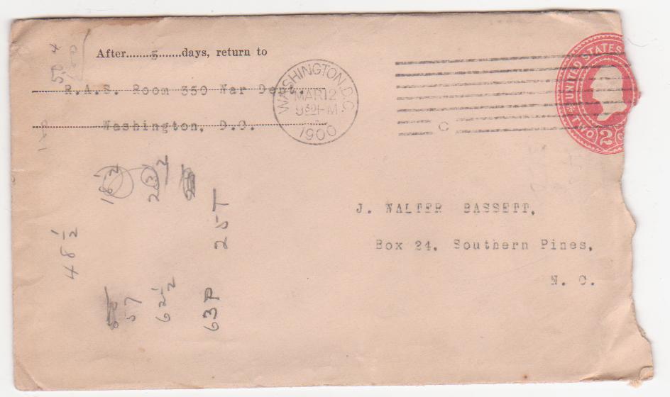 My letter writing is all behind, so shall not be able to talk with you very long, just want to let you know you are not forgotten. The fact is, I don’t know where the time goes to. Lately I have hardly had a moment to myself outside of the office, as Mrs. White, (whom you met at Southern Pines with her little boy Warren) has been here with her daughter, eighteen years old, and I have been trying to entertain them. They left for Boston last Monday. Speaking of the office, I am still there, but do not expect to be much longer, as they are reducing the force very rapidly, and only a few, who have a bigger “pull” than I have, will be retained in the permanent Census bureau [sic] which you may have read, will be organized July 1st. I am really fortunate to have stayed even this long. While things are so unsettled I can make no plans for the summer, but shall probably go north about June or July, and board at reading with Mrs. Danforth, as I always feel so much at home there, but intend returning to Washington in the fall. My cousins are well and would want to be remembered if they knew I was writing. I met your cousin only a few days ago, they ar4e also well.